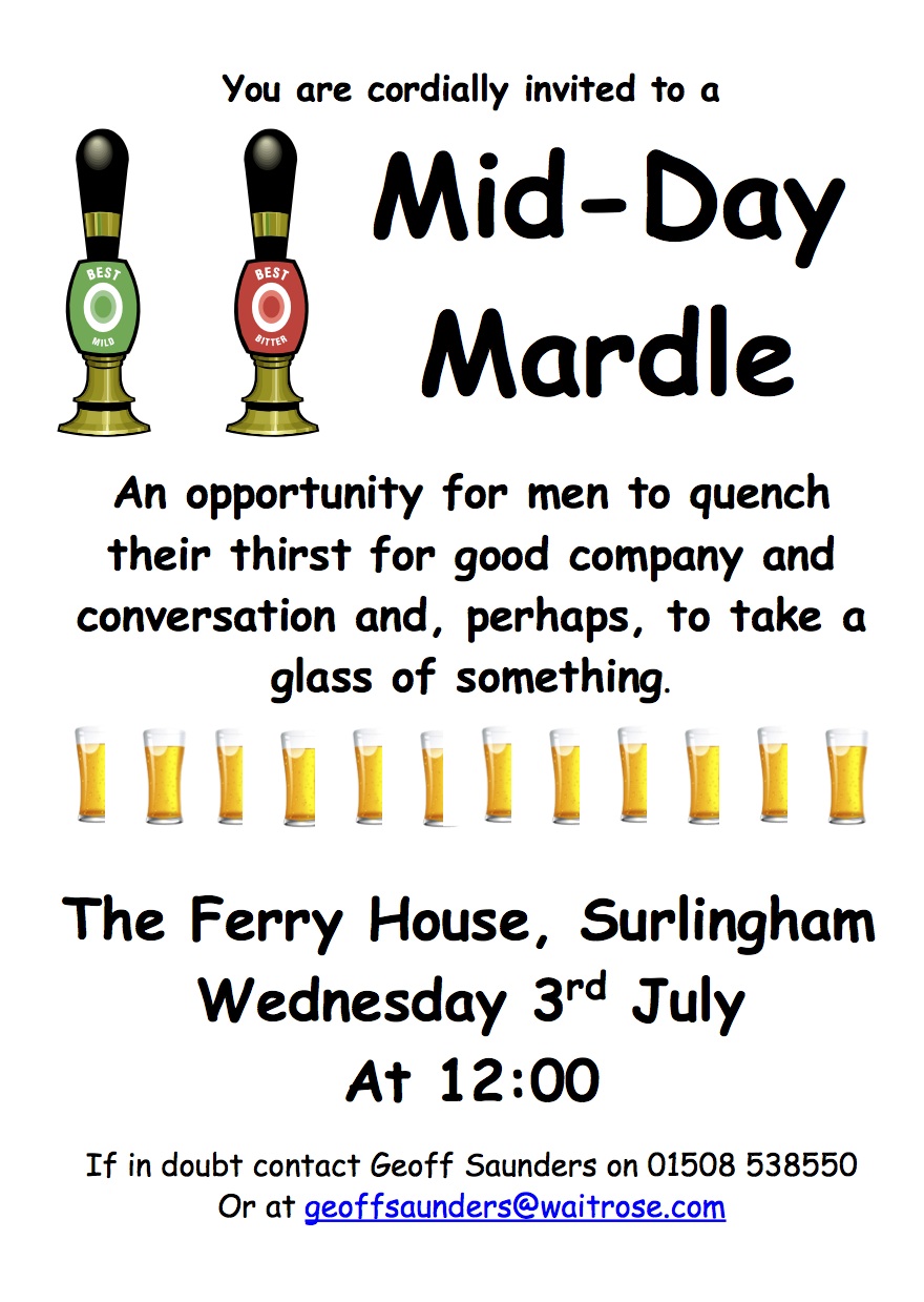 - Mens Mardle 08/03/2026 at 12:00 – 14:00 Surlingham Ferryn1 Ferry RoadnSurlinghamnNorfolknNR14 7ARnUnited Kingdom