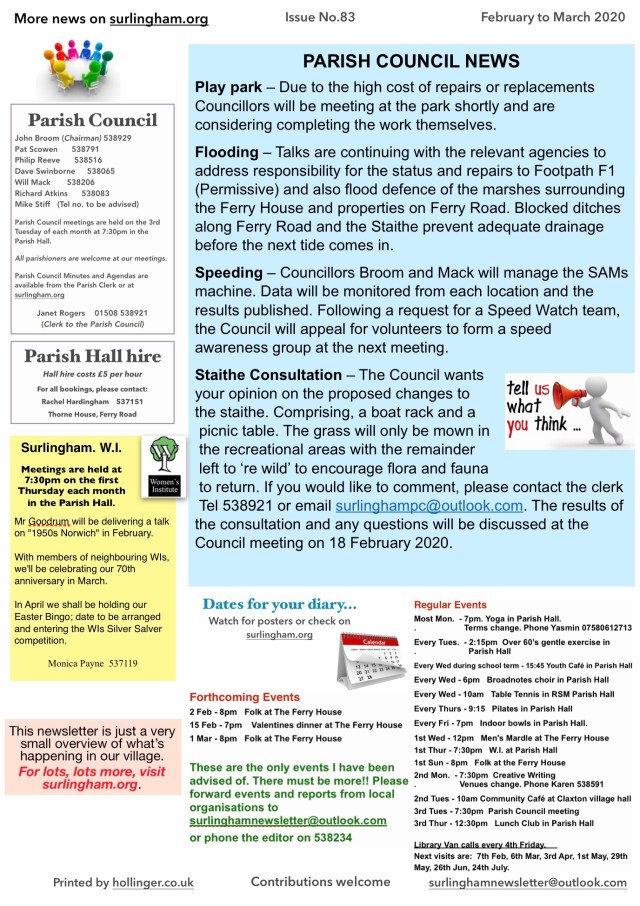 • Agenda for Surlingham Parish Council’s meeting being held on Tuesday 10th February 2026