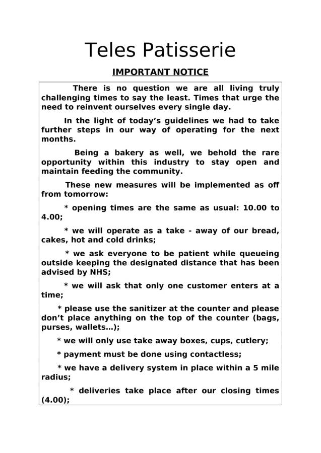 Teles Patisserie – important notice