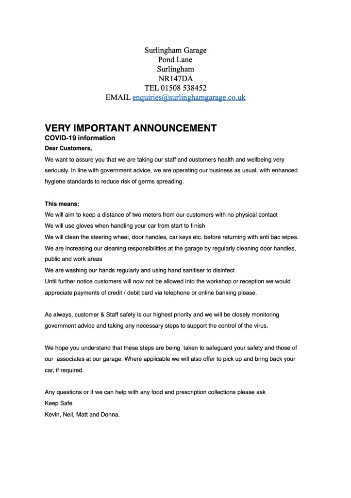 Announcement from Surlingham Garage