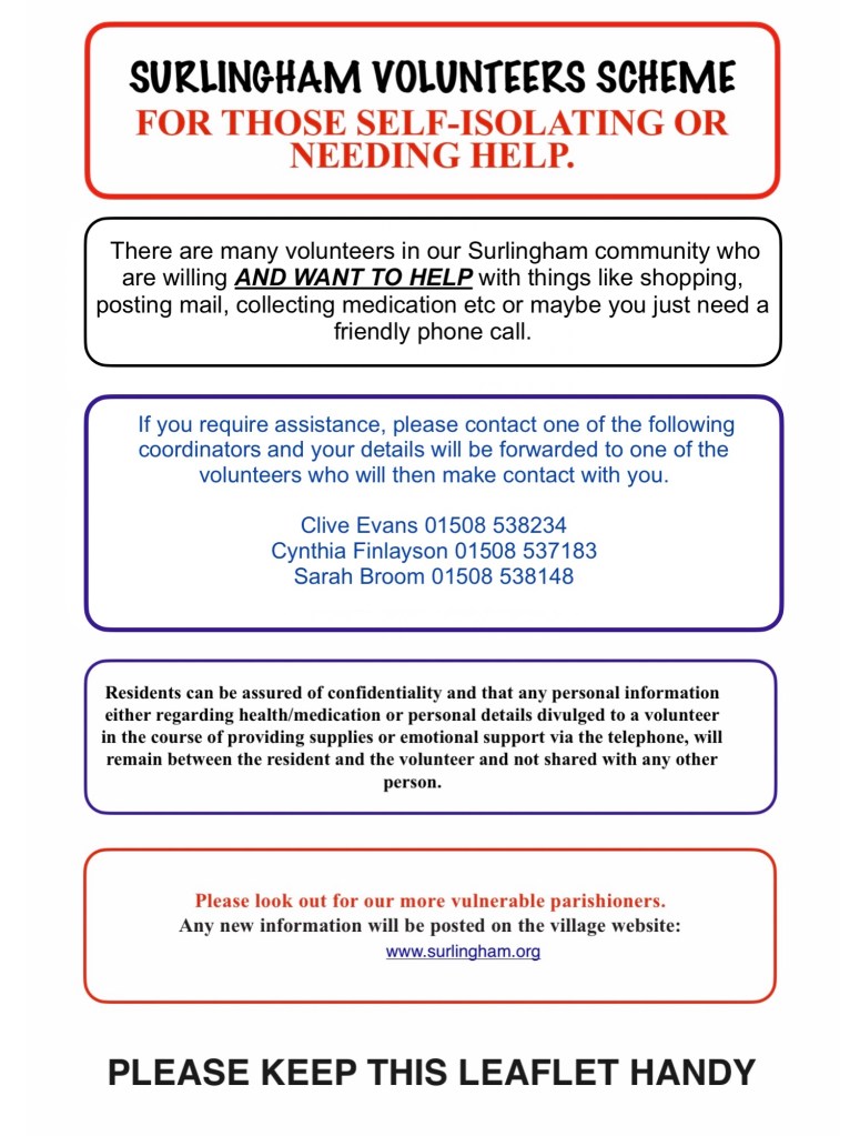 The Surlingham Volunteers Scheme which was so effective during the first lockdown is returning and will help to deliver food and medicine to local residents who have no other means of support.