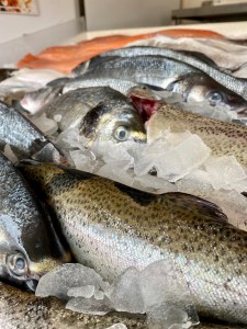 Plaice fillets, salmon fillet, whole sea bass, whole sea bream, sea bass fillets, haddock fillet, cod fillet, wild sea bass, sea trout fillet, turbot, monkfish, fish pie mix, tiger prawns, scallops, tuna, skate wing, smoked haddock, shell on prawns, smoked salmon, peeled brown shrimps, anchovies, oysters, crayfish tails, samphire, squid salad, kippers, dressed crabs, smoked mackerel, kiln roast salmon, cockles and rollmops.