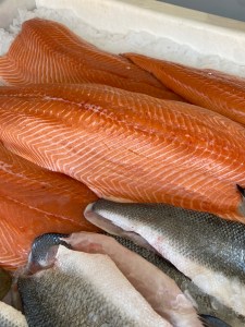 Plaice fillets, salmon fillet, haddock fillet, cod fillet, halibut fillet, whole trout, whole sea bream, whole sea bass, sea bass fillets, mackerel cutlets, monkfish fillet, tiger prawns, sashimi tuna, scallops, skate wing, smoked haddock, smoked salmon, shell on prawns, rollmops, kippers, oysters, samphire, anchovies, squid salad, peeled brown shrimp, cockles, crayfish tails, hot smoked salmon, smoked mackerel, dressed Cromer crabs.