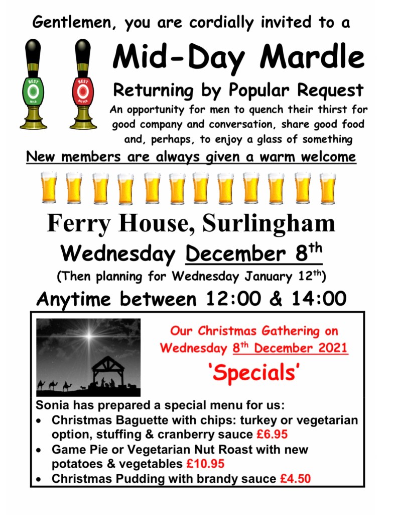 - Mens Mardle 08/02/2026 at 12:00 – 14:00 Surlingham Ferryn1 Ferry RoadnSurlinghamnNorfolknNR14 7ARnUnited Kingdom