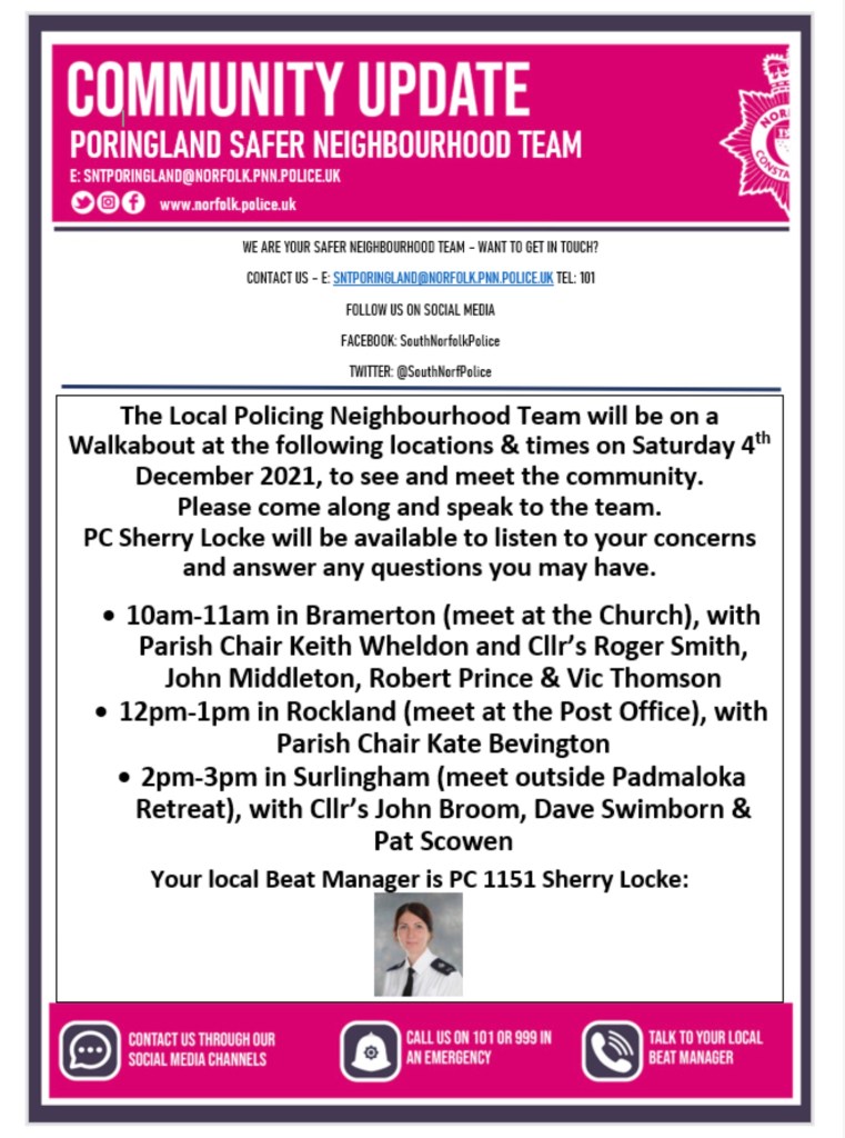 PC Sherry Locke from the Local Policing Neighbourhood Team, will be conducting a walkabout in Surlingham with Parish Councillors John Broom, Dave Swinborne & Pat Scowen.