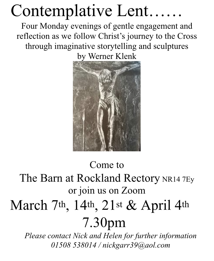 There has been a change to the livestream of the ‘Contemplative Lent’ series of quiet reflective evenings that begin in the Barn on Monday 7th at 7.30pm. There are further details on the flyer below. If you would like to join us online, please use this Zoom link for all 4 evenings