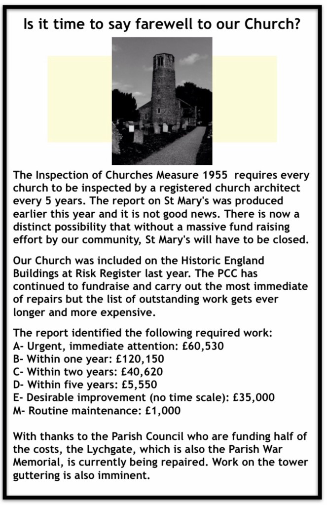 Funding applications to the National Lottery Heritage fund and others are currently being produced. We have many professionals in our village with skills in administration, marketing, publicity, bid writing, legal work and project management etc. The PCC would be delighted if you could help us in this project. Please help our village by offering some of your time to save St Mary’s for future generations to enjoy. Please contact Derry Kelleher 538597, or any member of the PCC.