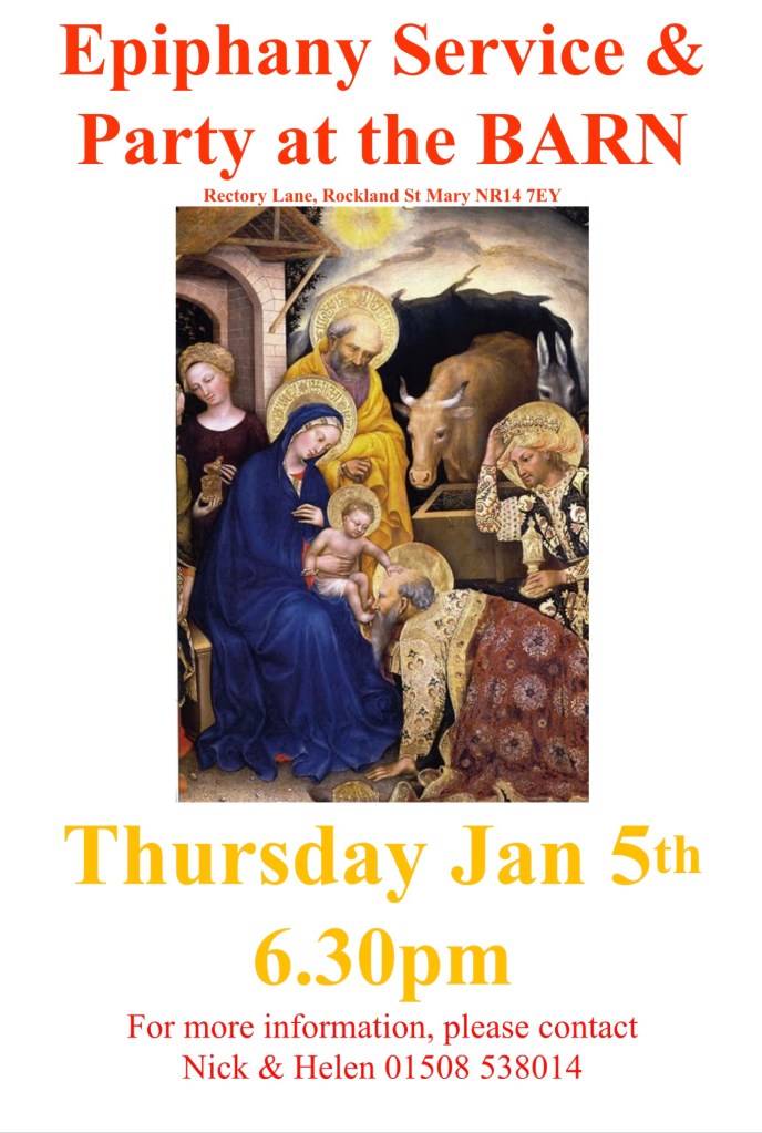 January 6th is Epiphany and celebrates the coming of the Magi to Jesus in the stable. Thursday 5th January is Epiphany Eve and we’re celebrating it with a 6.30pm Communion in the Barn at Rockland St Mary followed by an Epiphany Party. Everyone is welcome.