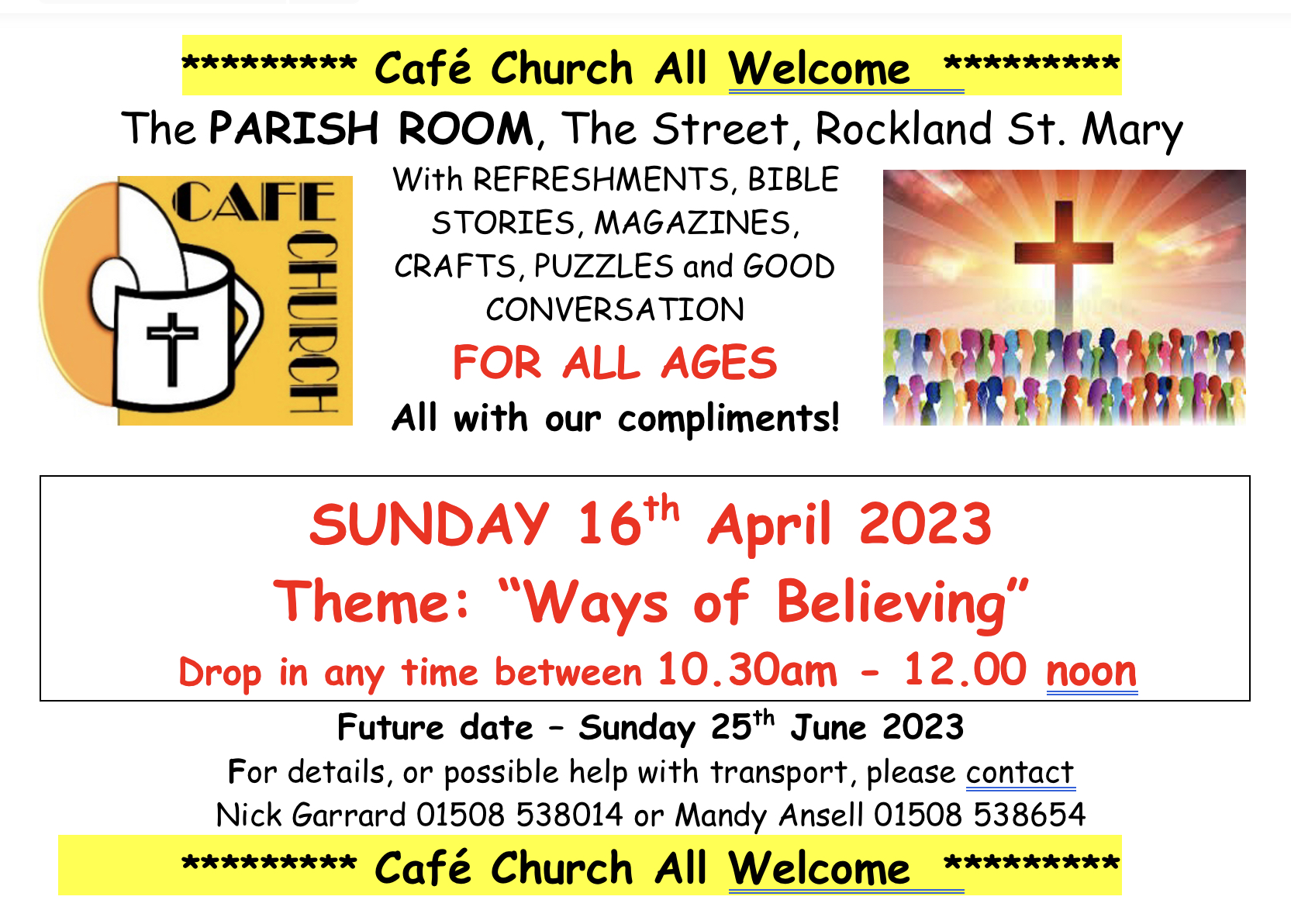 Cafe Church, “Ways of Believing”, 10.30am this Sunday morning, 16th April, Parish Room, Rockland St. Mary. All welcome.