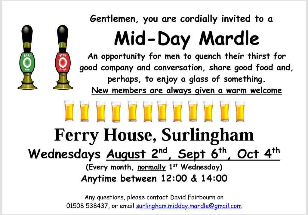Just a quick reminder for our next Men’s Midday Mardle tomorrow, Wednesday 2nd August, at Surlingham Ferry between 12.00 and 14.00. Please do come and join us for any time you can spare (our regular table is booked and Sonia and the staff are looking forward to seeing us), for a chat, drink and food, as you prefer.
