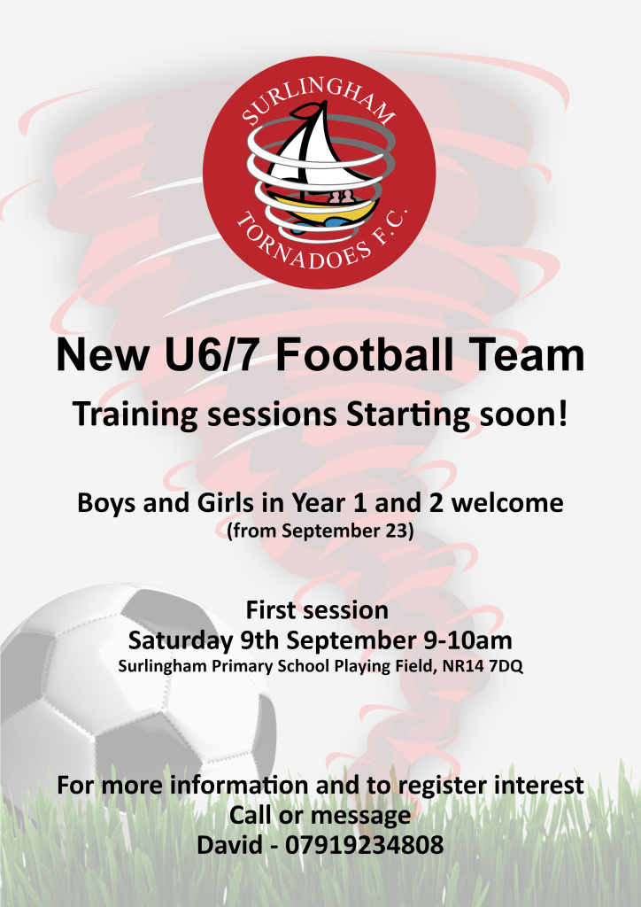 Surlingham Tornadoes Football team are recruiting Girls and Boys in Year 1 and 2 for their new Under 6/7 team. Training will start on Saturday 9th September from 9 to 10am and then every Saturday thereafter.