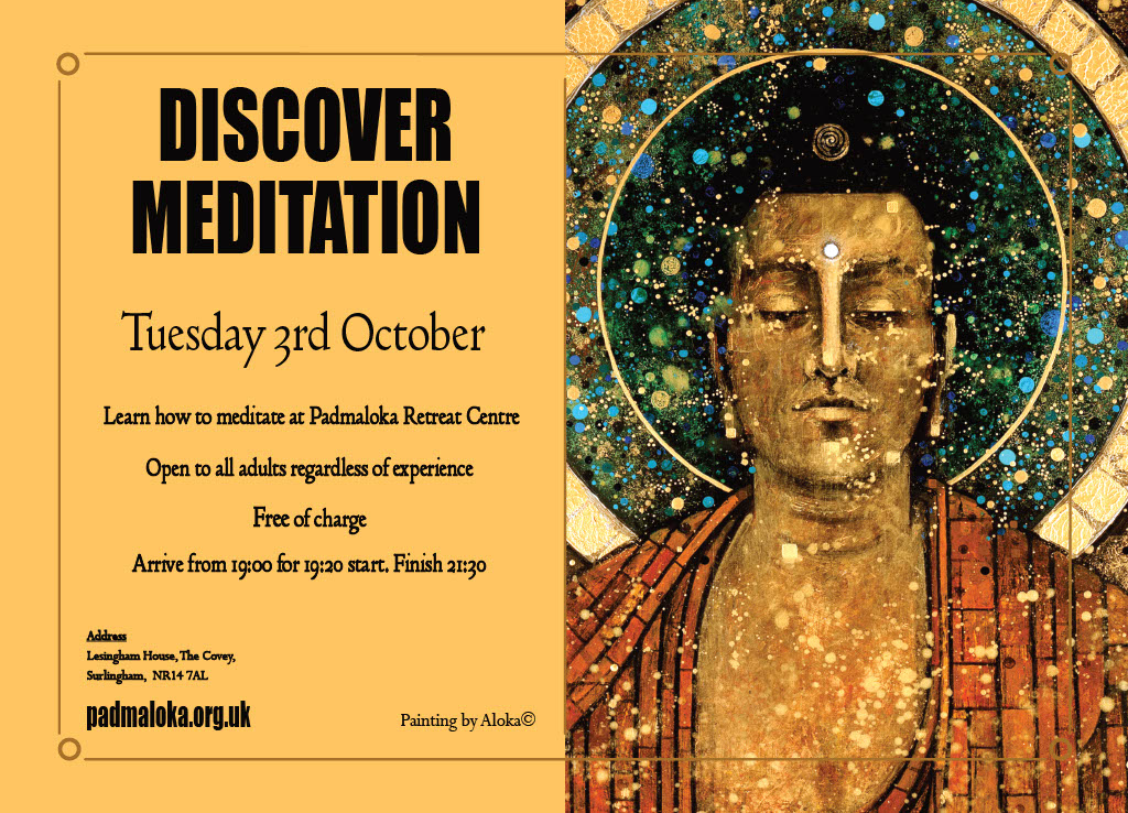 For almost 50 years Padmaloka has been running retreats in the heart of Surlingham. On Tuesday the 3rd of October we welcome all adults in the surrounding community to come and experience the spirit of the place in an evening of meditation.