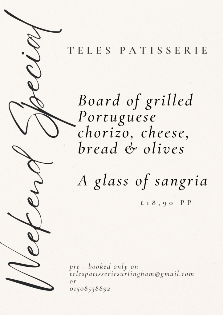 And our weekend specials are back! This Saturday & Sunday we are having the return of the Portuguese grilled chorizo with sides and sangria! Pre – booking only on 01508538892 or via email telespatisseriesurlingham@gmail.com