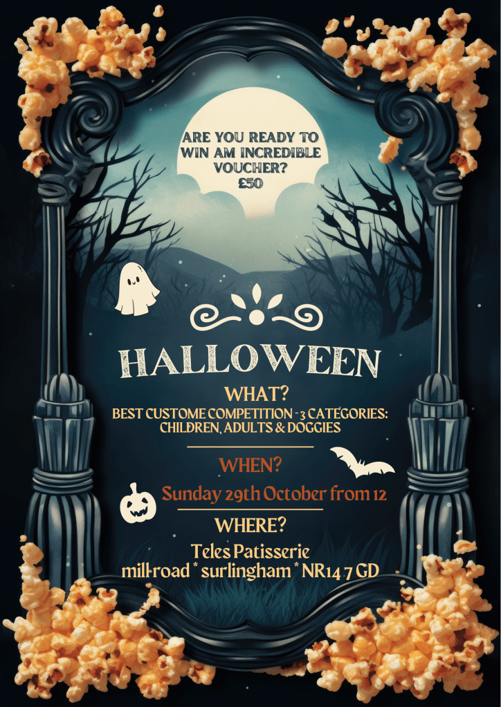 And this is coming fast! We have a Halloween competition this time! Come down to the patisserie on Sunday 29th of October with you family friends or doggies dressed in the best of your Halloween customers and try to win a Christmas hamper of £50!