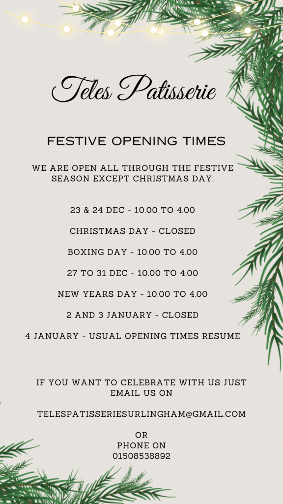 What will happen down here this weekend? We will be open as usual 10 to 4 for our usual yumminess and also for take away cakes and desserts. We will have loads of display on both days in case you haven’t ordered. Also it’s the last couple of days to find that great Portuguese wine with us (there is still plenty around here) or to get that last minute hamper!