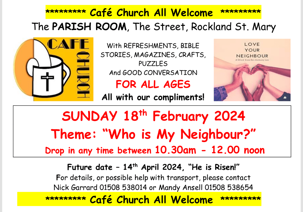 Cafe Church ‘Who is My Neighbour’, this Sunday, 18th February 10.30 – 12.00, Parish Room, Rockland St Mary. All welcome!