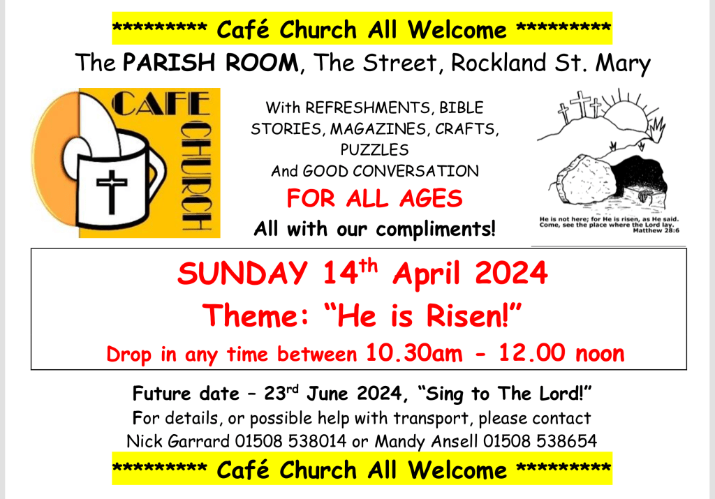 Cafe Church ‘He is Risen’, this Sunday, 14th April 10.30 – 12.00, Parish Room, Rockland St Mary. All welcome!