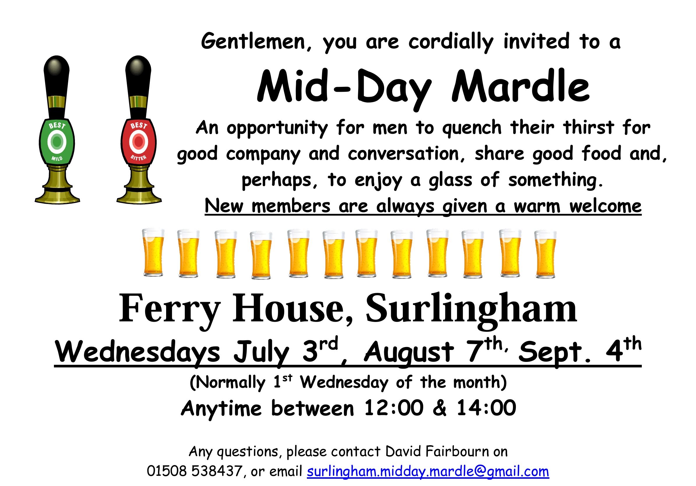 • Mens Mardle 08/01/2026 at 12:00 – 14:00 Surlingham Ferryn1 Ferry RoadnSurlinghamnNorfolknNR14 7ARnUnited Kingdom