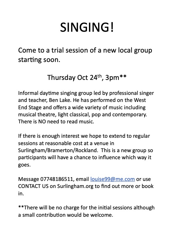 Fifteen of us thoroughly enjoyed the first trial session of a new, local, daytime singing group last Thursday. The second session with be on 24th October . Please get in touch to come along – all welcome.