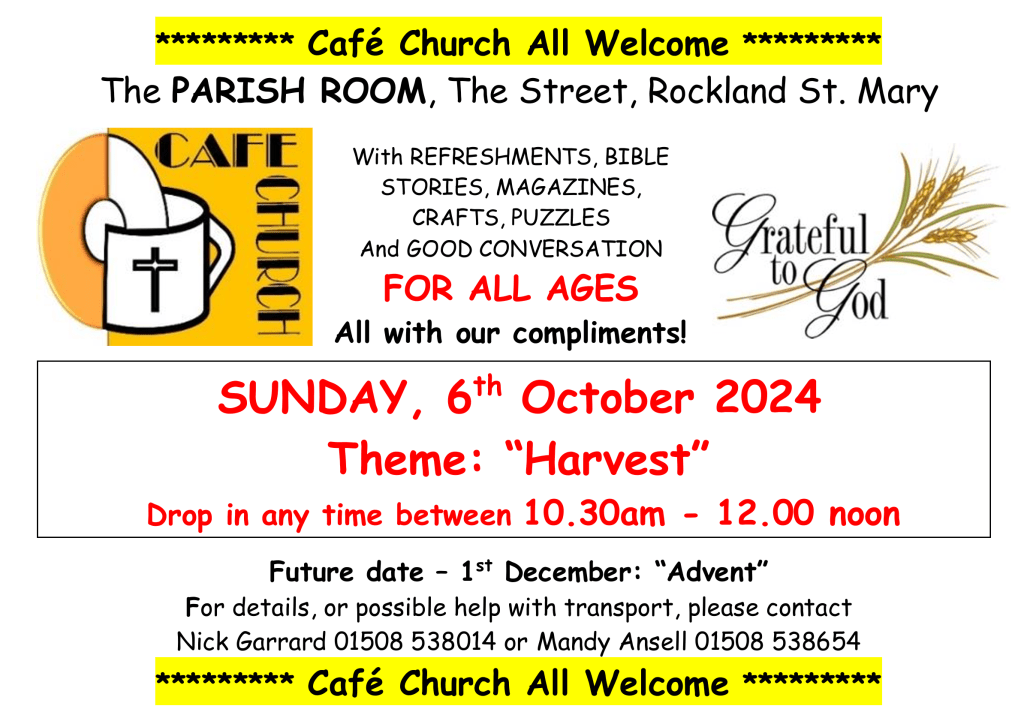 Cafe Church this Sunday, 6th October, in the Parish Room, Rockland St. Mary: “Harvest”.