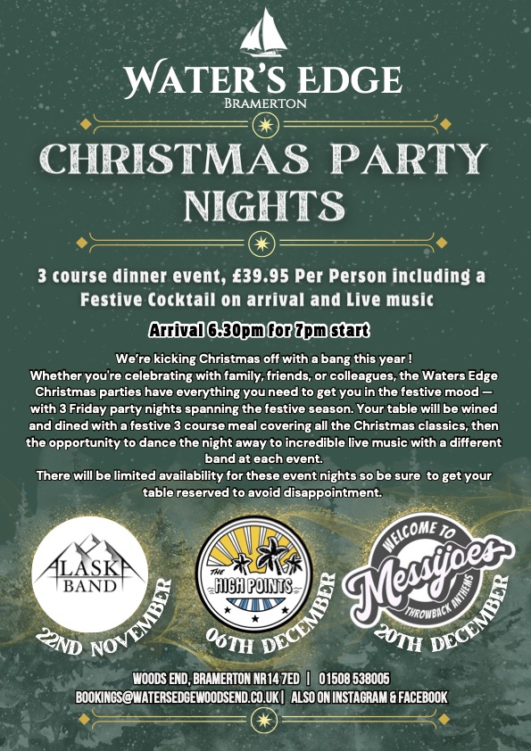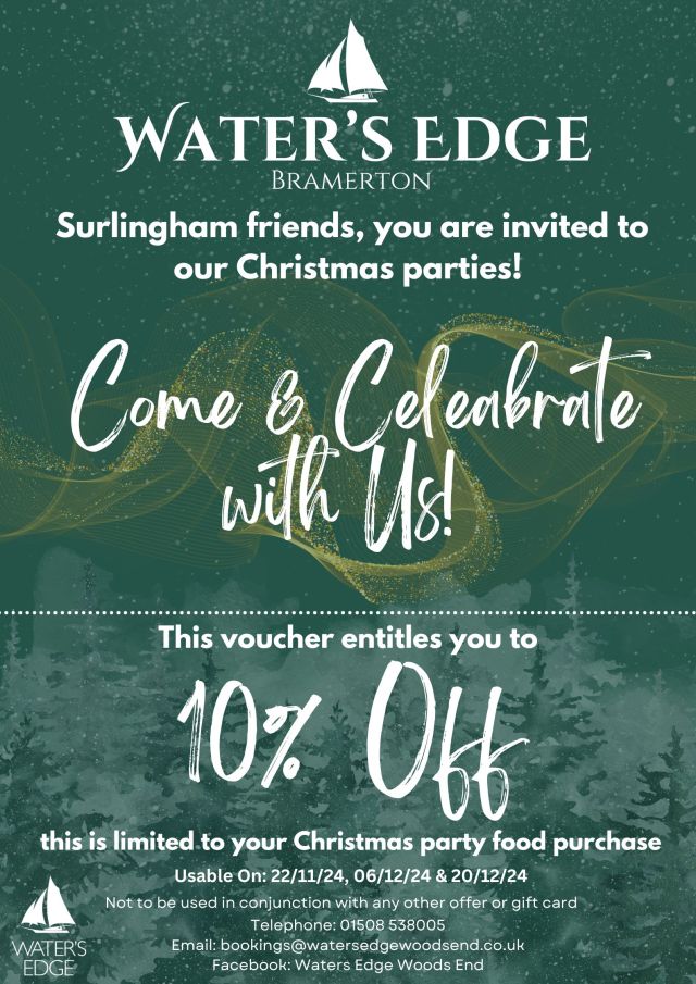 Water’s Edge Bramerton are offering a discount of 10% to Surlingham.org viewers at their Christmas party nights on 22nd Nov, 6th Dec and 20th Dec. Print voucher below.