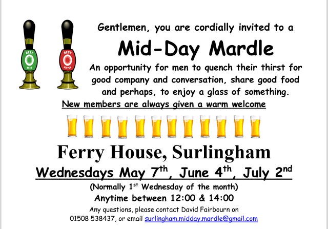 Men’s Midday Mardle this coming Wednesday, 7th May, at Surlingham Ferry between 12.00 and 14.00