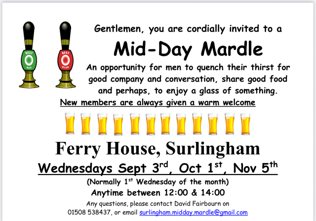 • Mens Mardle 08/01/2026 at 12:00 – 14:00 Surlingham Ferryn1 Ferry RoadnSurlinghamnNorfolknNR14 7ARnUnited Kingdom