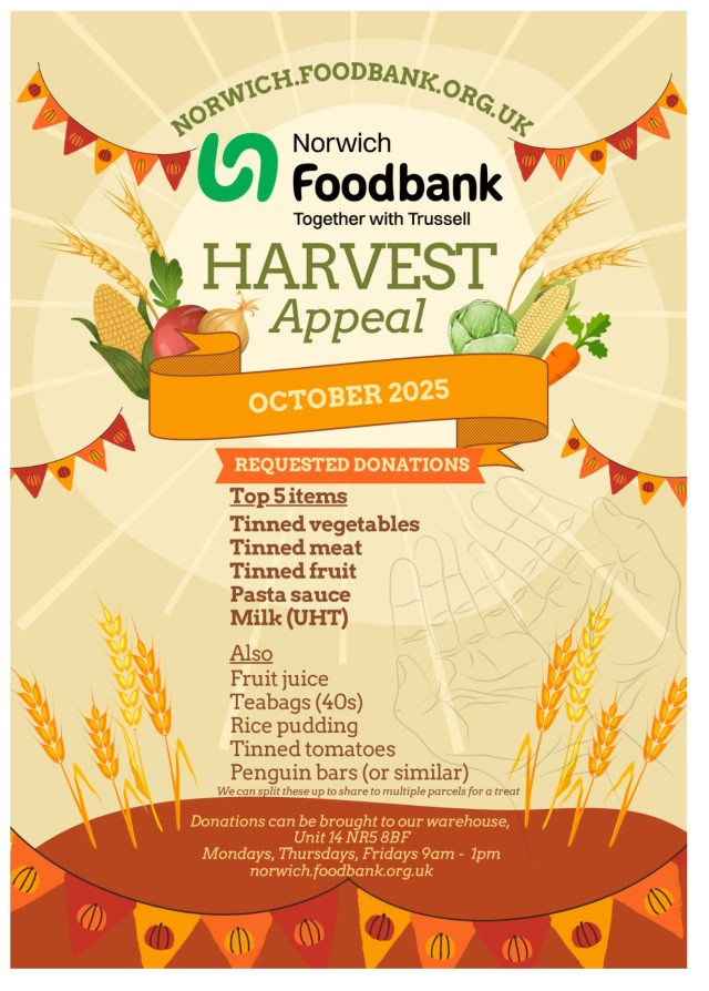 7th September marks the beginning of the Harvest Festival season, with the Harvest Thanksgiving at Carleton St. Peter, 11am. All long-life foods gratefully received, but the Norwich Foodbank are particularly hoping for items listed on their attached poster. Donations can be made at our harvest services or the Rectory until October 15th. After Carleton’s service you’re warmly invited to stay on for snacks and drinks, with all donations to church funds. At Claxton (9.30am) Communion will be celebrated.